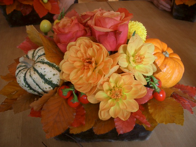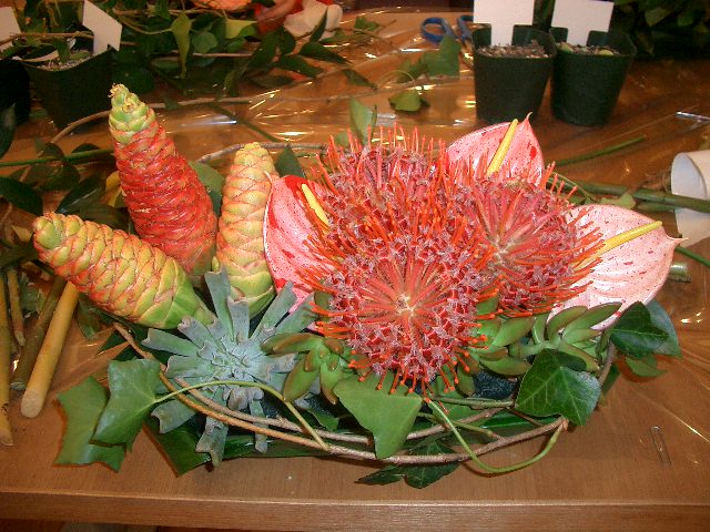 ピンクッションという花をメインに、多肉植物を取り入れてまとめたアレンジ。